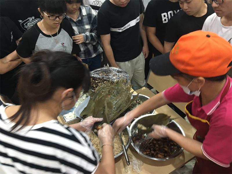 由于大部分学生都是第一次包粽子,大家都是在食堂工作人员的指导下一步步完成一个个粽子,现场气氛非常好,大家互帮互助,互相教导,既锻炼了动手能力又培养了创造力,大家做出来的粽子形状各异,有说有笑,在大家眼里仿佛已经不是一场比赛了。